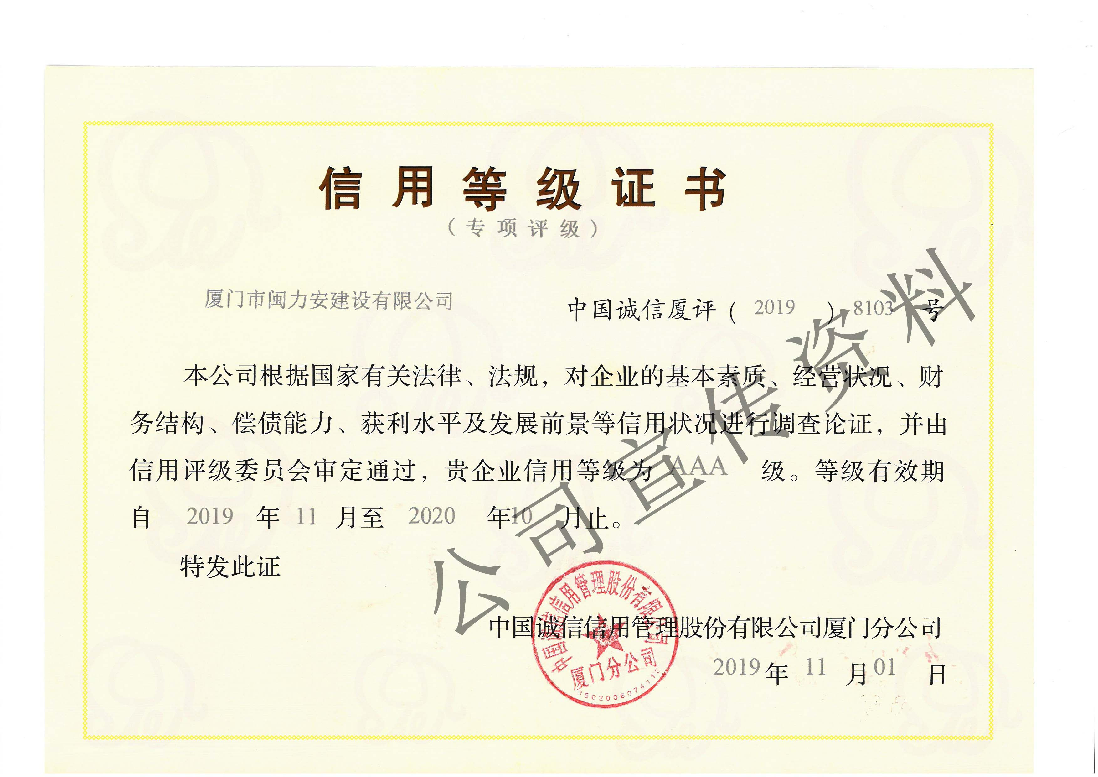 廈門市閩力安建設(shè)有限公司成立于2003年,公司取得市政公用工程施工總承包貳級、建筑裝修裝飾工程專業(yè)承包壹級、城市及道路照明工程專業(yè)承包壹級、電子與智能化工程專業(yè)承包貳級、消防設(shè)施工程專業(yè)承包貳級、電力工程施工總承包叁級、建筑機(jī)電安裝工程專業(yè)承包叁級、輸變電工程專業(yè)承包叁級、環(huán)保工程專業(yè)承包叁級、照明工程設(shè)計(jì)專項(xiàng)甲級、建筑裝飾工程設(shè)計(jì)乙級、施工勞務(wù)等資質(zhì)的綜合型企業(yè),公司于2013年通過了ISO9001質(zhì)量體系認(rèn)證,ISO14001環(huán)境管理體系認(rèn)證,OHSAS18001職業(yè)健康安全管理體系認(rèn)證。